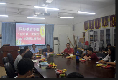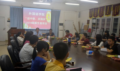 9月11日晚,外语国教两院在7栋313室为远道而来的新生举办“迎中秋 庆国庆”座谈会,邀请2016级各班新生代表、团总支学生会干部一起畅谈如何度过一个有意义的大学生活。学院党总支书记谭玉清及全体辅导员参加了座谈会。会议由办公室主任蔡岳良主持。