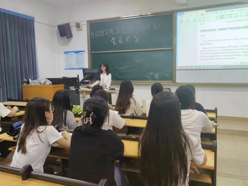 今年4月至7月,在全党开展党纪学习教育,是以习近平同志为核心的党中央加强党的纪律建设、推动全面从严治党向纵深发展的重要举措。习近平总书记高度重视这次党纪学习教育,多次发表重要讲话、作出重要指示。外国语学院结合学校实际作出安排,推动党员干部在学习贯彻《中国共产党纪律处分条例》上下功夫见成效,将党纪学习教育工作融入“三会一课”、组织生活、主题党日等。外国语学院学生党支部于5月6日以来陆续组织开展关于《中国共产党纪律处分条例》的学习会,全体学生党员同志参会。会议由各党支部书记主持。