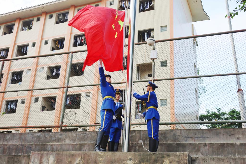 7:00,升旗仪式开始,国旗护卫队队员们护送鲜艳的五星红旗进场。伴随着激昂的《义勇军进行曲》响起,全体师生面向国旗肃立,凝视着五星红旗冉冉升起,共同唱响国歌。