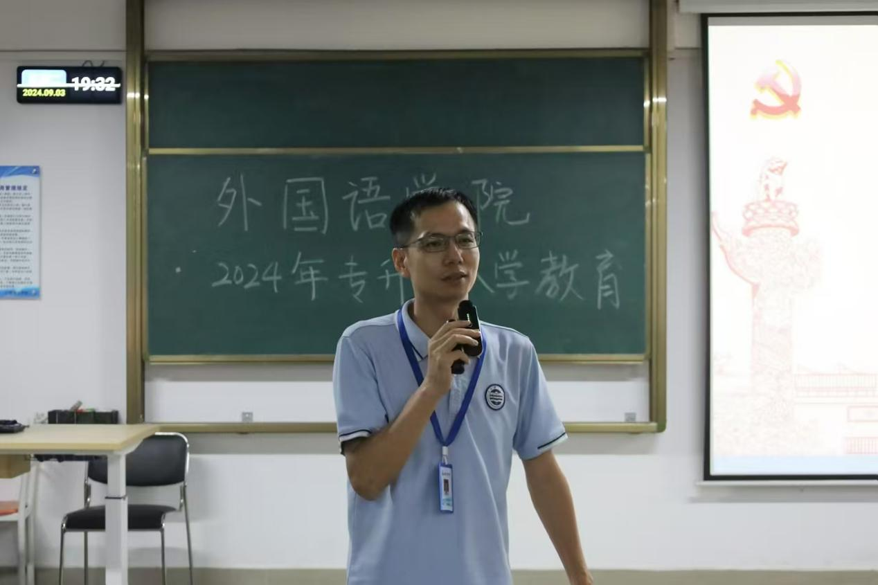 为帮助新生适应新环境,‌了解校园文化以及介绍外院院情和未来发展前景,外国语学院于2024年9月3日晚19:00在13栋603举行2022级专升本新生入学教育。本次入学教育由外国语学院党总支书记、副院长冉海涛主持。外国语学院韩院长进行讲解。2022级专升本全体同学参与。