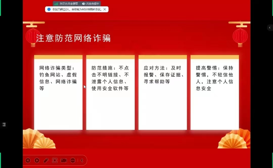 班会伊始,各班班委严格落实班会考勤,保证全体同学参加会议。紧接着,班会主持人就近期的校园文化、教学和学生事务等方面进行了讲解。随后,班会主持人从人身财产安全、交通安全、消防安全、旅游安全、饮食安全和电信网络安全等方面为同学们进行了详细地介绍。主持人提醒同学们在遇到陌生人搭讪时,需提高警惕,避免泄露个人信息。在遇到突发情况,及时报警,寻求帮助。同时,主持人强调了在国庆假期期间应严格遵守交通规则,注意交通安全;掌握火灾应急逃生技能,注意用电安全,增强多方面安全意识。最后,各班班会主持人了播放关于国庆日由来的视频,进而增强同学们的爱国精神,落实爱国主义教育。