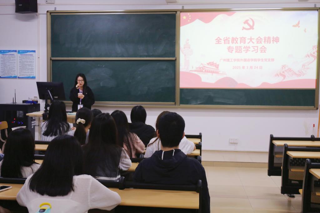 为进一步推进支部党员认真学习贯彻全省教育大会精神走深走实,激励支部成员强化使命担当,增强党组织的凝聚力和战斗力,3月24日晚,外国语学院学生第三党支部在7栋302教室召开“全省教育大会精神”专题学习会。外国语学院学生第三党支部全体在校党员参会。会议由学生第三党支部副书记卢琳同志主持。