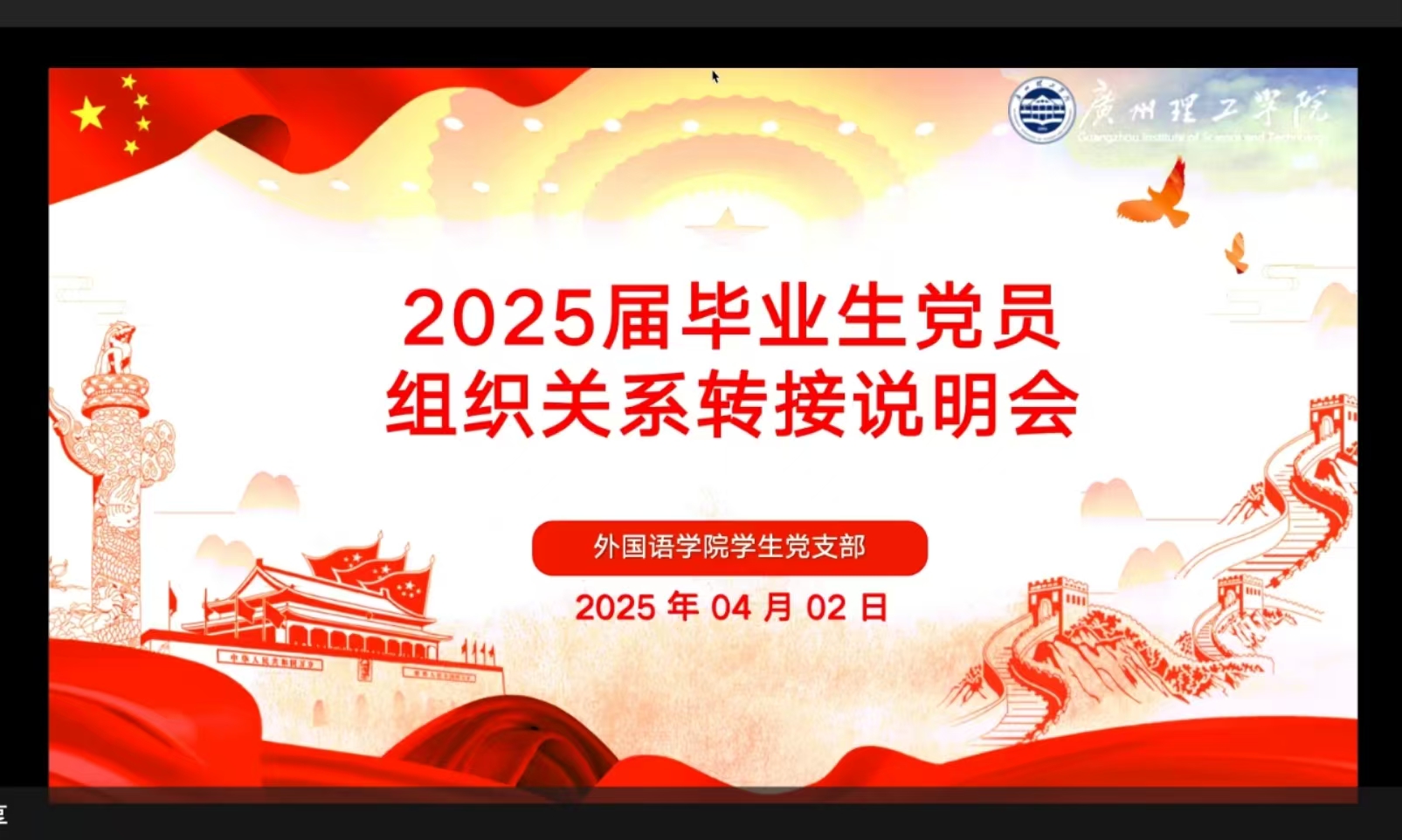 为帮助毕业生党员顺利完成组织关系转接,确保相关工作规范、有序进行,2025年4月2日,外国语学院学生党支部以腾讯会议的形式召开了2025届毕业生党员组织关系转接说明会。本次会议由学生第二党支部副书记苏倩怡主持。党总支组织员罗晓博及学生党支部全体2025届毕业生党员同志参会。