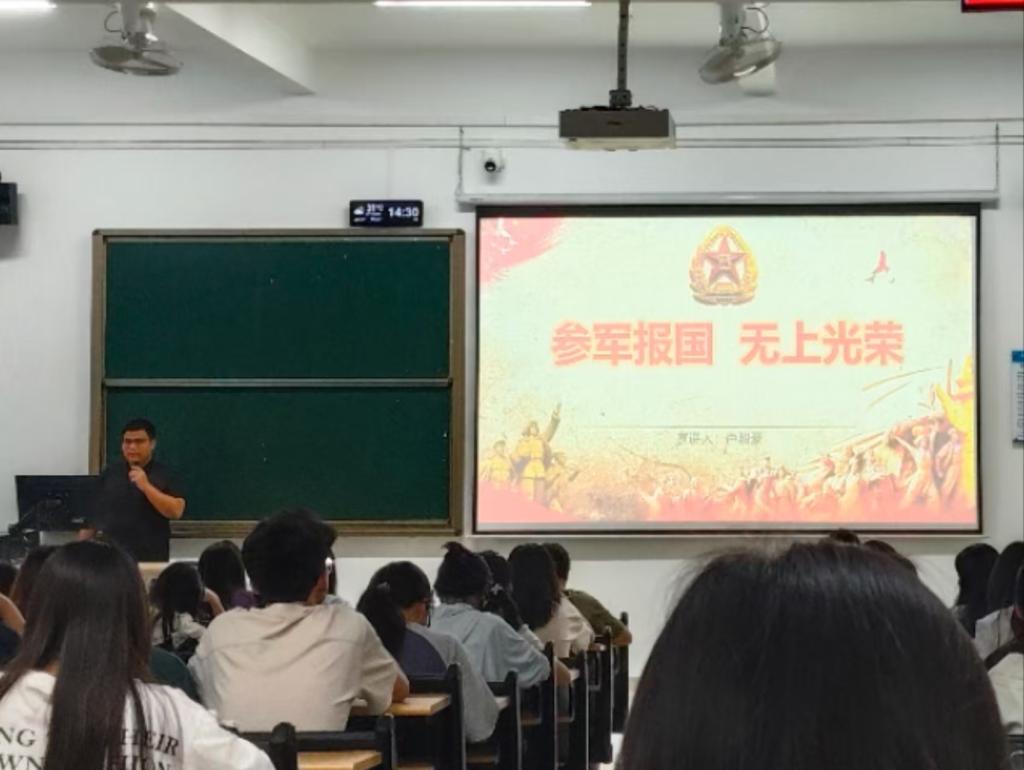 为全面贯彻落实国家征兵政策,激发适龄青年投身国防事业的壮志豪情,培育新时代青年的家国情怀与社会担当,5月14日14:30至15:30,外国语学院在广州校区6-101教室成功举办征兵入伍宣讲会。本次活动由21英语3班退伍大学生卢骏豪与科创部成员柯沅妤担任主讲。外院学子踊跃参与。