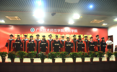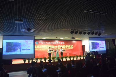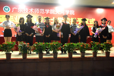 仪式在全体毕业生齐声奏唱国歌和院旗展出中拉开序幕。党总支书记谭玉清宣读了《广东技术师范学院天河学院关于公布2017届优秀毕业生名单的通知》。在感谢师恩环节,毕业生代表心中满怀深深不舍,为老师及家长献上鲜花,全场毕业生齐声“老师,您辛苦了,谢谢您”,将典礼推上新高潮。随后,毕业生代表彭安妮同学、教师代表刘蕾分别代表毕业生和教师作了热情洋溢的发言。