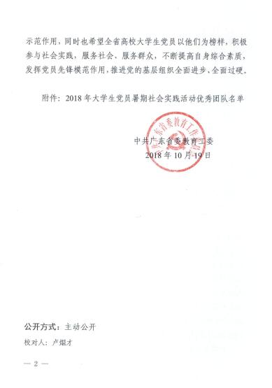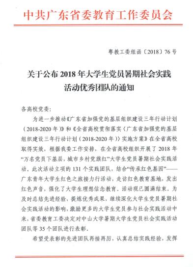 近日,从广东省委教育工委获悉,我校外国语学院主题为“保护海洋生态建设美丽渔村”保护海洋生态环境的暑期大学生党员社会实践活动获教育工委通报表彰。今年全省高校暑期大学生党员社会实践活动立项131项,获通报表彰项目35个。此次省委教育工委的表彰,是对我校大学生党员社会实践活动工作的充分肯定。
