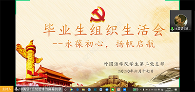 (通讯员:胡碧锋)6月17日晚,外国语学院学生第一、第二党支部在腾讯会议召开毕业生党员组织生活会,外国语学院学生第一党支部书记李昉,外国语学院学生第二党支部书记黄思敏以及2016级全体毕业生党员参加,会议分别由廖惠慈和胡碧锋同志主持。