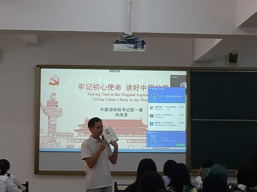 冉海涛书记讲授了题为《牢记初心使命,讲好中国故事》的专题课,从“习近平总书记的青春寄语”“理解传统中国”“理解当代中国”“读原著,悟原理”四个篇章授课,希望我们不忘初心、牢记使命,勇做时代的弄潮儿,努力在实现中国梦的生动实践中放飞青春梦想。冉书记指出,作为外国语学院的一名学生,我们需要牢记习近平总书记对全国高校外语人才的要求与期许,做一个有中国情怀、有全球视野、有专业本领的复合型人才,在新时代传播中华优秀文化,发出中国声音,讲好中国故事,不断提高国际传播影响力、中华文化感召力、中国形象亲和力、中国话语说服力和国际舆论引导力。冉书记使用时政热词解读中华文化,强调在政治上忠诚尽责,带领我们领悟中华文化的魅力,进一步提升了我们的思想觉悟、道德水准、文明素养,也使我们更加坚定讲好中国故事的决心。