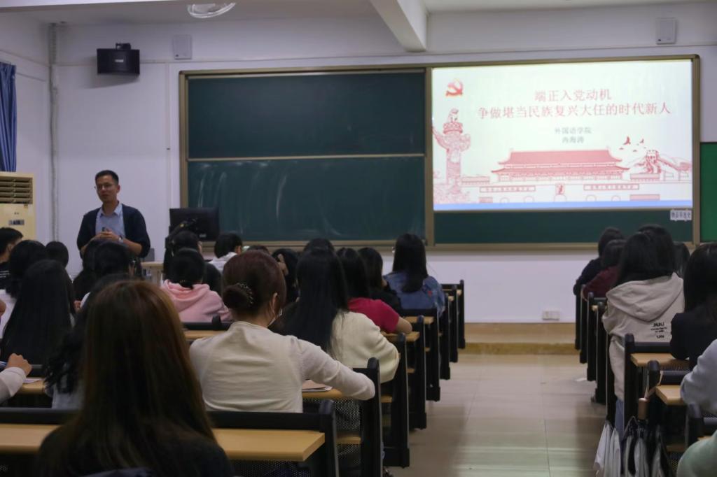 为进一步端正入党积极分子的入党动机,提升其党性修养,外国语学院学生党支部于3月22日晚在7栋303课室开展2023年第1期入党积极分子党课培训。本次党课由党总支书记冉海涛主讲,2023年第1期全体入党积极分子参加。