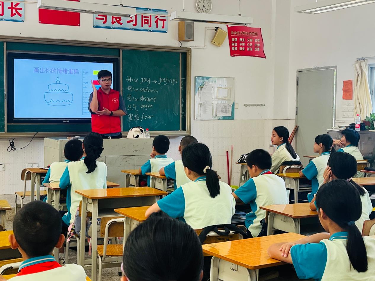 今天的支教活动主要针对五年级学生开设。我院暑期社会实践团队成员实现从学生身份到老师身份的转变,采用灵活多变的教学方法,激发学生的学习兴趣。在教学过程中,老师们用丰富的肢体语言,由浅入深,带领同学们体会不同的情绪感受。在学生与老师的互动中,同学们能感受到英语学习的乐趣。老师们还通过播放视频,帮助同学们更好地识别情绪。最后,老师们使用绘图教学的方式与同学们一起绘制“情绪蛋糕”,让同学们在此过程中学会用英语表达自己的心情并在日常生活中合理表达自己的情绪,以积极乐观的态度面对未来的生活。