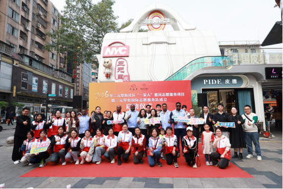 仪式上,三元里街国际志愿服务队正式授旗成立,队员代表庄严宣誓,承诺以语言为桥、以服务为本,积极投身社区涉外服务。随后,与会嘉宾共同为志愿服务工作室揭牌,并宣布2026年“一家人”惠民志愿服务项目全面启动。活动现场还设立了公益服务集市,涵盖多语言咨询、应急救护、便民服务等体验环节,生动展现了志愿服务的温暖与活力。