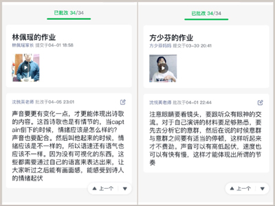 为了让演讲能够达到更好的状态,演讲前的模拟必不可少。由于疫情的原因,学生没有办法在教室里呈现自己的演讲,老师也没有办法当面进行讲评和指导,所以沈悦英老师布置课后录制模拟演讲视频任务,对于学生的模拟演讲进行指导,帮助学生更好的找到演讲的感觉,适应演讲的状态。