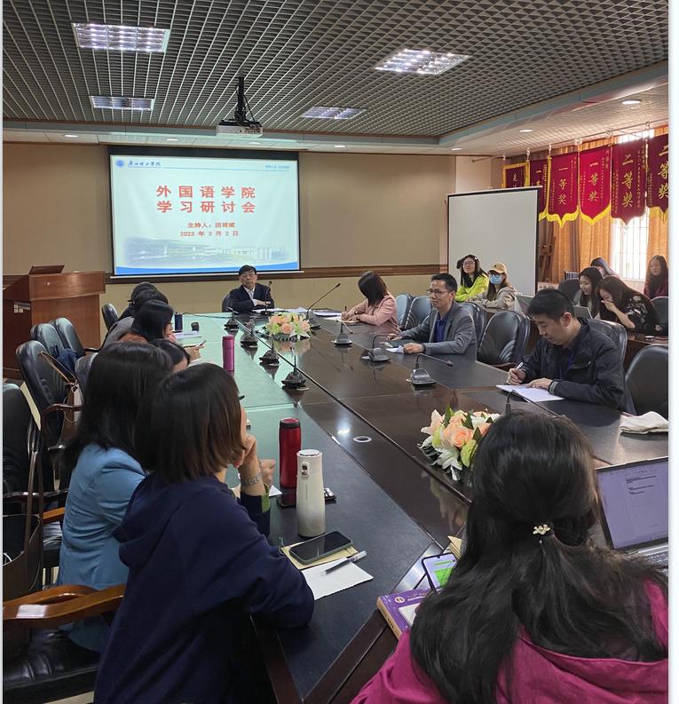 3月2日,为进一步落实学校有关工作要求, 外国语学院召开集体学习研讨会,征求《构建新发展格局 促进高质量发展实施纲要(2023-2026)》修改意见。会议由院长田祥斌主持,党总支书记冉海涛、副书记蔡俊、副院长冯军霞和学院全体教师参加学习研讨。