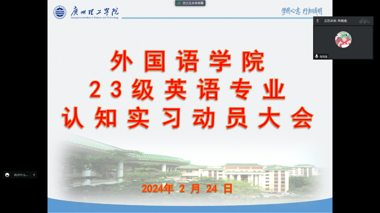 (温单婷)2024年2月24日,外国语学院为即将到来的23级英语专业认知实习活动召开了线上动员会议。此次会议旨在为学生们提供明确的实习指导,确保实习工作的顺利进行。会议由冉海涛书记主持,冯军霞副院长、实践教学秘书、系主任、惠州校区辅导员、实习班级班导师以及实习带队老师均出席了此次会议。23级英语专业学生也积极参与其中。