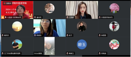 近日,外国语学院成功举办了优秀校友线上调研座谈会。本次座谈会旨在加强校友与学院之间的联系,分享校友们的职业经验和人生感悟,为在校学生们提供宝贵的建议和指导。本次座谈会的参会领导有外国语学院党总支书记、副院长冉海涛,副院长冯军霞,系主任潘宏妍,系主任申丹,教师谢薇,辅导员方书靓。参会优秀校友代表有江雨婷、杨锦琼、赖碧玉、李旭辉、王意梅、肖雯、陶嘉毅、钟丽丽。