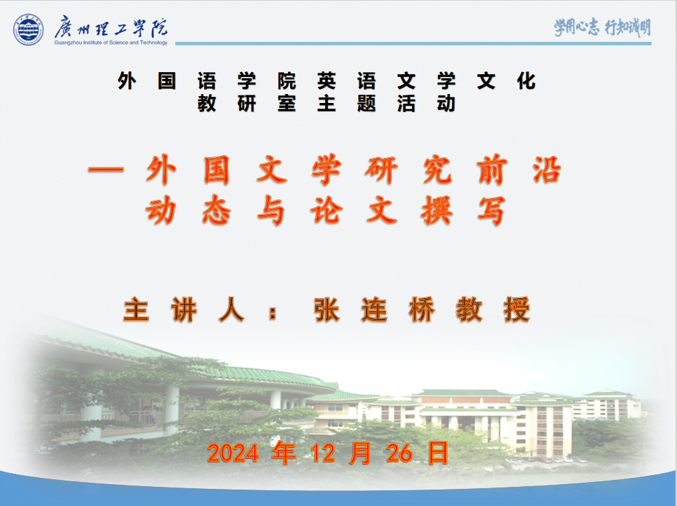 12月26日19:30,英语文学文化教研室举行了以“外国文学研究前沿动态与论文撰写”为主题的线上研讨会。广州大学人文学院教授张连桥担任主讲嘉宾。会议由教研室负责人、外国语学院副院长冯军霞主持。教研室教师参会。