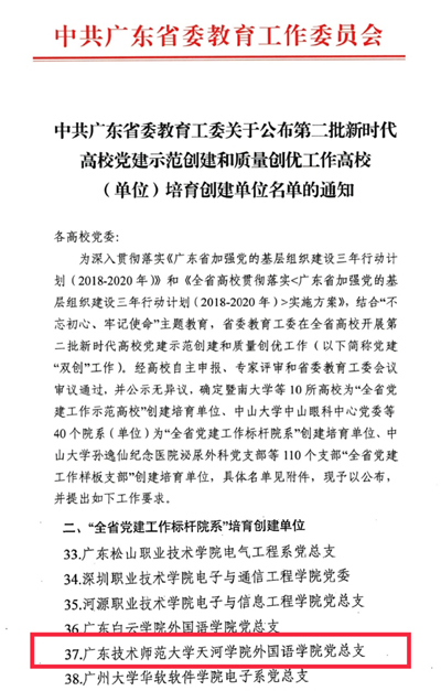 外国语学院党总支入选广东省第二批新时代党建“双创”工作标杆院系培育建设单位