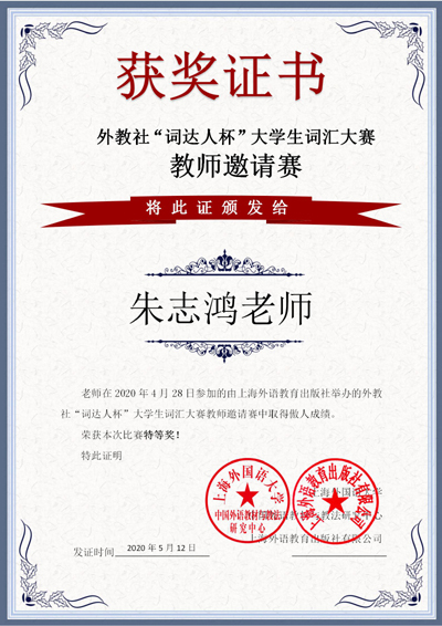 我院教师朱志鸿在“外教社•词达人杯”教师邀请赛中荣获特等奖