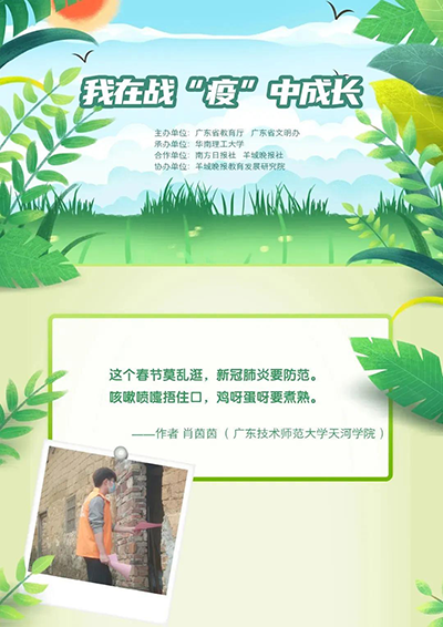 (通讯员:胡碧锋)战疫防控期间,我院学子“宅”在家中,而此“宅”非彼宅,他们“宅”出了不一样的故事。近日,广东省教育厅、广东省文明办围绕“坚决打赢疫情防控的人民战争、总体战、阻击战”主题,面向全省普通高校在校学生,举办“我在战‘疫’中成长”广东高校大学生抗疫征文活动,受到了同学们的追捧,同学们用自己的创作来表达对打赢这场疫情防控阻击战的决心与勇气。