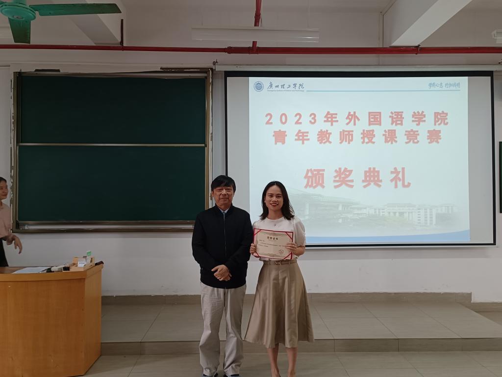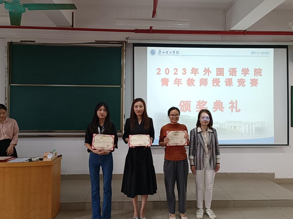 示范课结束后,外国语学院院长田祥斌,党总支书记、副院长冉海涛,党总支副书记蔡俊及副院长冯军霞对此次在青年教师竞赛中获奖的老师进行颁奖。