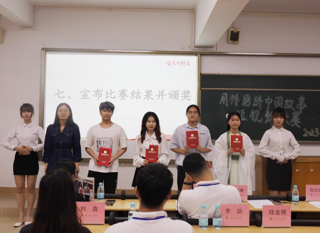 本次赛事共吸引170余名学生参与,投稿作品总数95份,经过激烈的角逐和评比,26份作品进入决赛。团队作品中,20英语2班钱嘉宝、20英语6班黄慧荣获一等奖;20英语10班江颖怡荣获二等奖;20英语3班徐素珍、20英语4班曾晓彤、20英语5班黄炫智、20计科1班廖子豪荣获三等奖;20电气1班张瑞基、22日语1班曾锈梅荣获优秀奖。个人作品中,20英语4班甘彩桦荣获一等奖;21英语4班廖婉莹、22商英2班黄诗婷、22英语1班周淑怡、22英语5班潘金亮荣获二等奖;22英语1班廖海燕、20英语2班梁贵晶、20英语16班马楚茹荣获三等奖;22汉语16班刘芷均、22造价2班江欣谊、22英语2班卢仲勤荣获优秀奖。20英语2班钱嘉宝团队、20英语2班梁贵晶荣获最佳人气奖、最佳视频制作奖;22商英2班黄诗婷荣获最佳视频制作奖,20翻译班陈舒暖团队、20英语10班江颖怡团队荣获最佳创意奖。