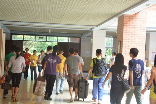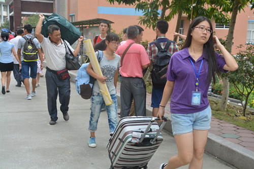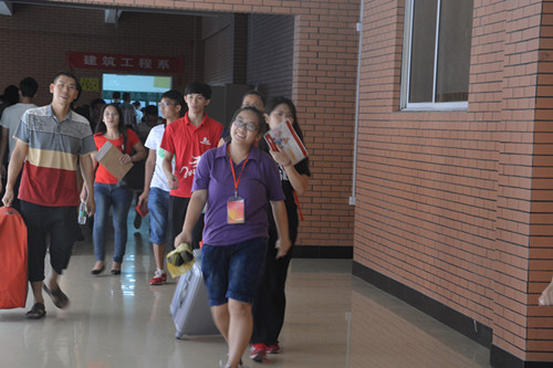 经过紧锣密鼓的迎新筹备工作后,迎新工作进行得井然有序。接车工作人员在公车到达的第一时间引导新生到达报道点,并带领家长到大本营休息,热情招呼家长。工作人员热情的笑脸、亲切的问候、贴心的服务、让新生和家长们感受到丝丝暖意。新生在工作人员的指引下独立地完成注册入学的各个程序,当今所倡导的独立自主在他们身上发挥得淋漓尽致。尽管天气非常炎热,但工作人员还是全身心投入到工作中。他们带领着新生穿梭于注册报到、领取军服等办理入学手续的地点之间,并且帮助新生搬行李,找宿舍,到处都是紫色的身影。各辅导员、助班也很热心地向新生介绍学校的情况,耐心地给他们解答疑惑。最后,在大家的齐心协力下,迎新工作顺利完成。