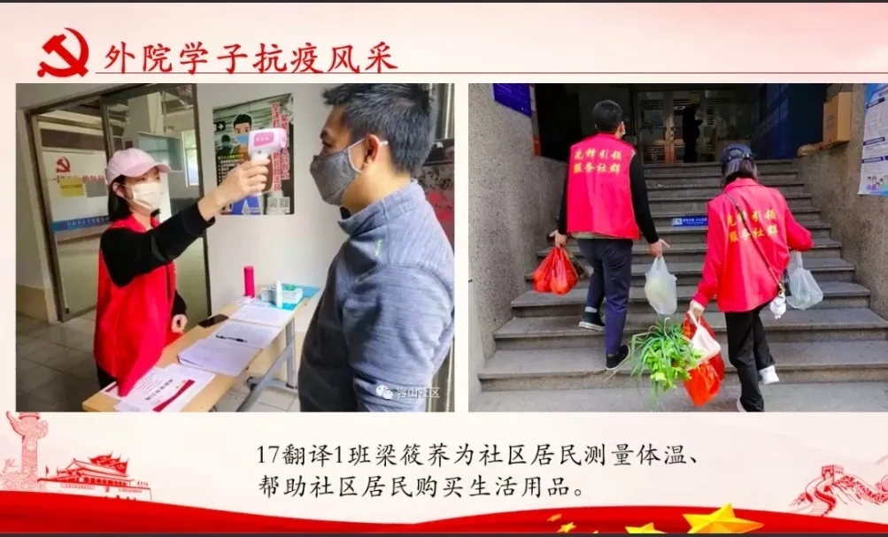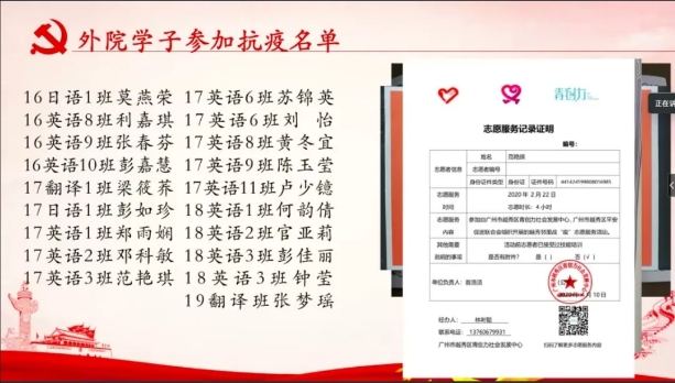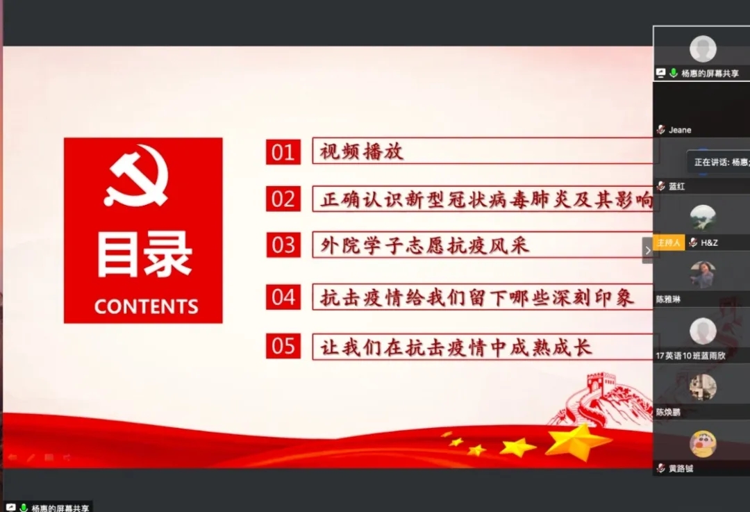 课堂中,杨惠书记围绕“正确认识新型冠状病毒肺炎及其影响、外院学子志愿抗疫风采、等四个方面对当前新冠肺炎的情况进行讲述,同时结合其在特殊时期所见所闻以及切身体会,启发同学思考现处的大时代,感恩大时代。杨书记指出, 外国语学院众多的学子在此次战疫中,挺身而出,冲锋在前,彰显了当代青年的勇气与担当。她期望同学们要积极学习抗疫志愿者的精神,争当有理想、有本领、有担当的新时代青年。时刻把安全放在最重要的位置上,做好每日的健康打卡和个人防护工作、居家严格遵守作息时间、勤思善问、扎实有效地完成学习任务;并能正确认识疫情防控知识做到不传谣,不信谣,拒绝野味,敬畏自然,就是最大的担当以及懂得常怀感恩之心并努力做一个充满爱、传播爱和奉献爱的人。