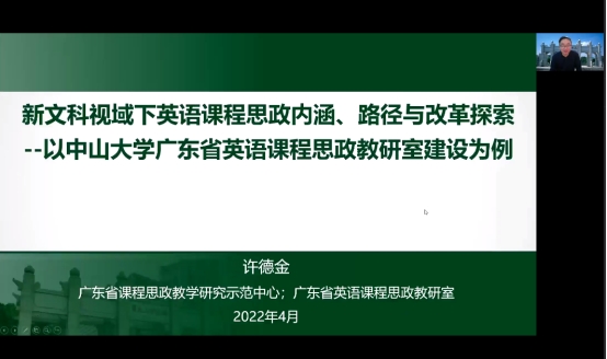 4月21日,中山大学外国语学院院长许德金教授于线上为我院全体教师开展了题为“英语课程思政的内涵,路径与改革探索”的学术讲座。