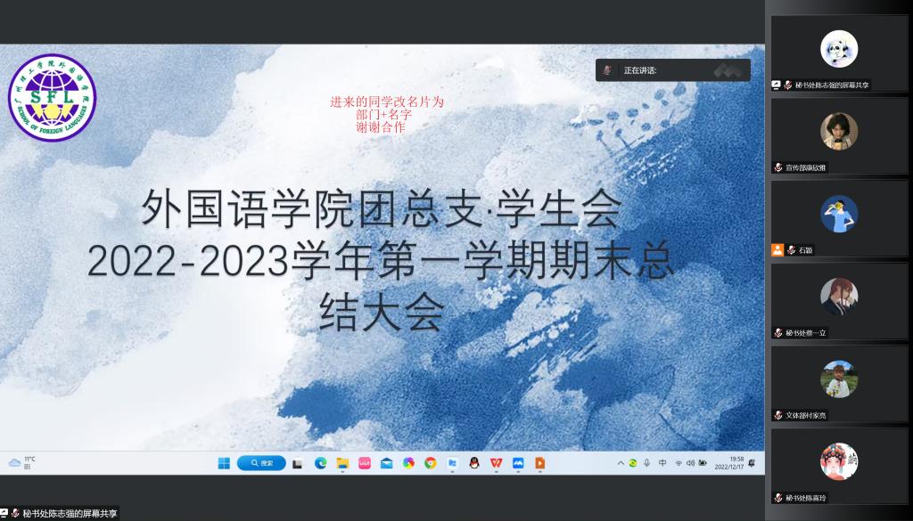 2022年12月17日,我院团总支·学生会于通过腾讯会议召开2022-2023学年第一学期工作总结暨表彰大会,总结本学期工作成果,进一步提升团总支·学生会工作水平。大会由秘书处干事陈志强主持,出席本次大会的有外国语学院团总支书记赵凯老师、团总支副书记兼学生会执行主席戴霖霖、团总支宣传委员兼学生会常务主席陈思洁、团总支文体委员兼学生会常务主席石颖、团总支组织委员梁城彰、文体艺术部部长许静雯和公关实践部部长刘龙达。