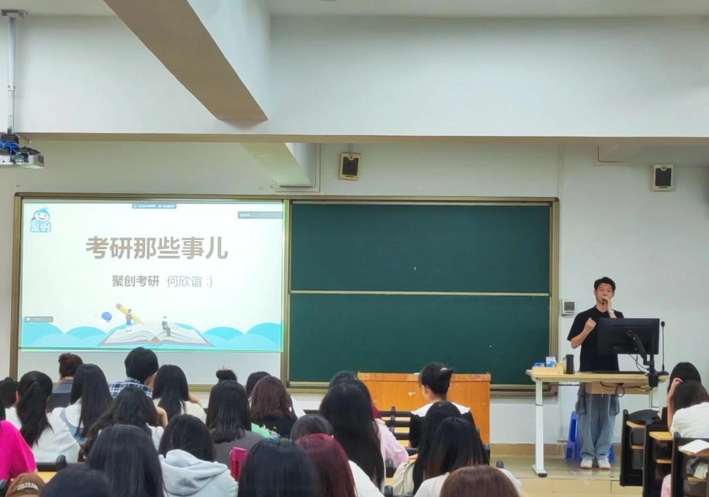 为进一步提升外国语学院学子的考研热情,明确考研目标,掌握考研复习相关技巧,4月24日上午,外国语学院在7栋418教室开展聚创考研专场讲座。本场讲座由聚创考研教育集团何欣谊老师主讲,温家豪老师主持。外国语学院21级学生参与此次讲座。
