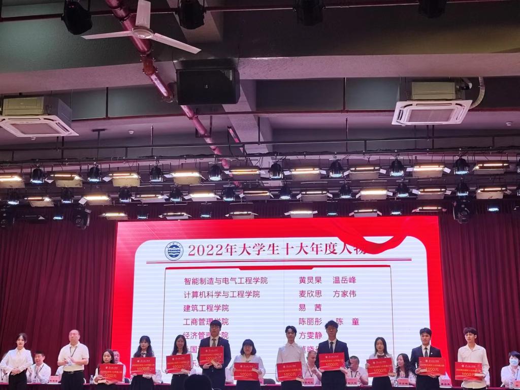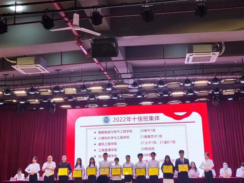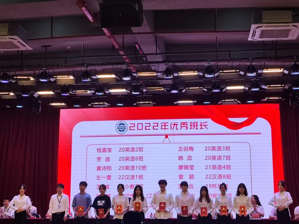 大会伊始,彭文刚书记宣读优秀班长、十佳班长、先进班集体、十佳班集体及2022年大学生十大年度人物表彰名单。其中我院获得十佳班集体荣誉称号的是20翻译班和20英语4班;获得先进班集体荣誉称号的为20英语7班、 20英语10班、21英语4班和21英语5班;获得十佳班长荣誉称号的是20翻译班蓝龙杰和20英语4班赖语丽;获得优秀班长荣誉称号的是20英语2班钱嘉宝,20英语3班王侣梅,20英语6班劳迪和20英语7班韩蕊 ,20英语10班黄诗翔和 21英语4班廖婉莹;被评为十大年度人物的为20英语3班莫晓丹。