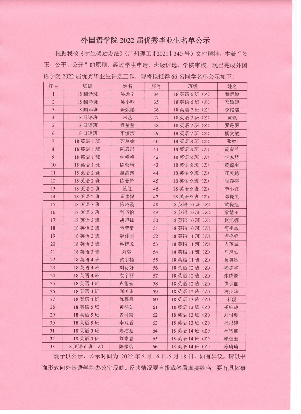 外国语学院2022届优秀毕业生名单公示