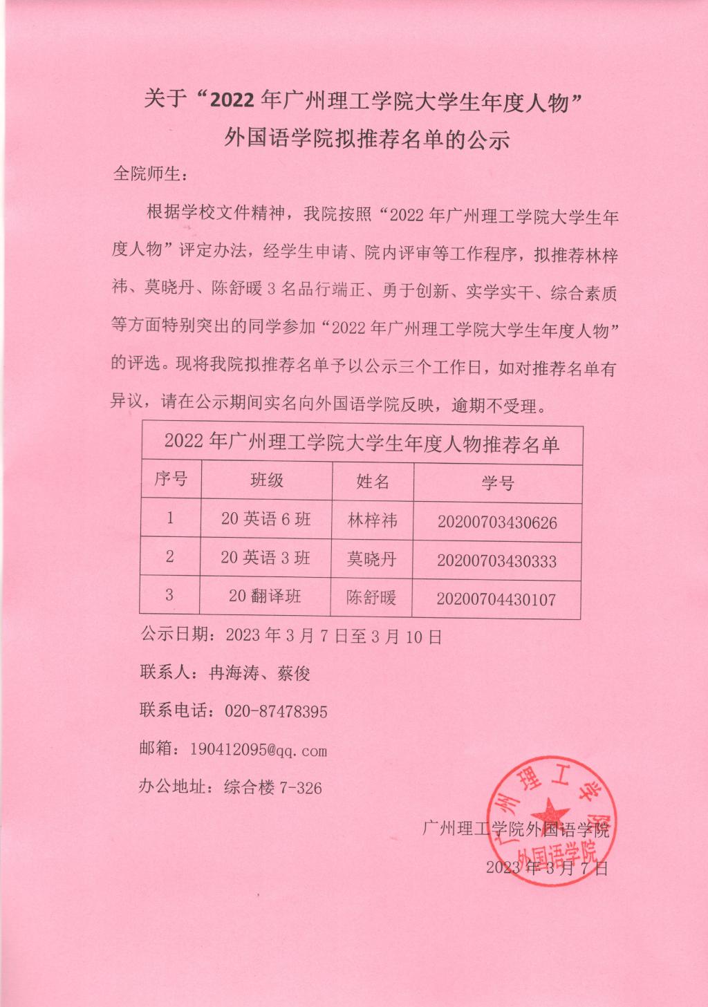 关于“2022年广州理工学院大学生年度人物”外国语学院拟推荐名单的公示
