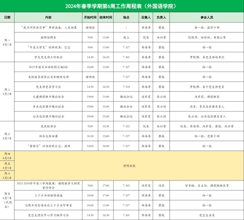 外国语学院2024年春季学期第6周工作周程表