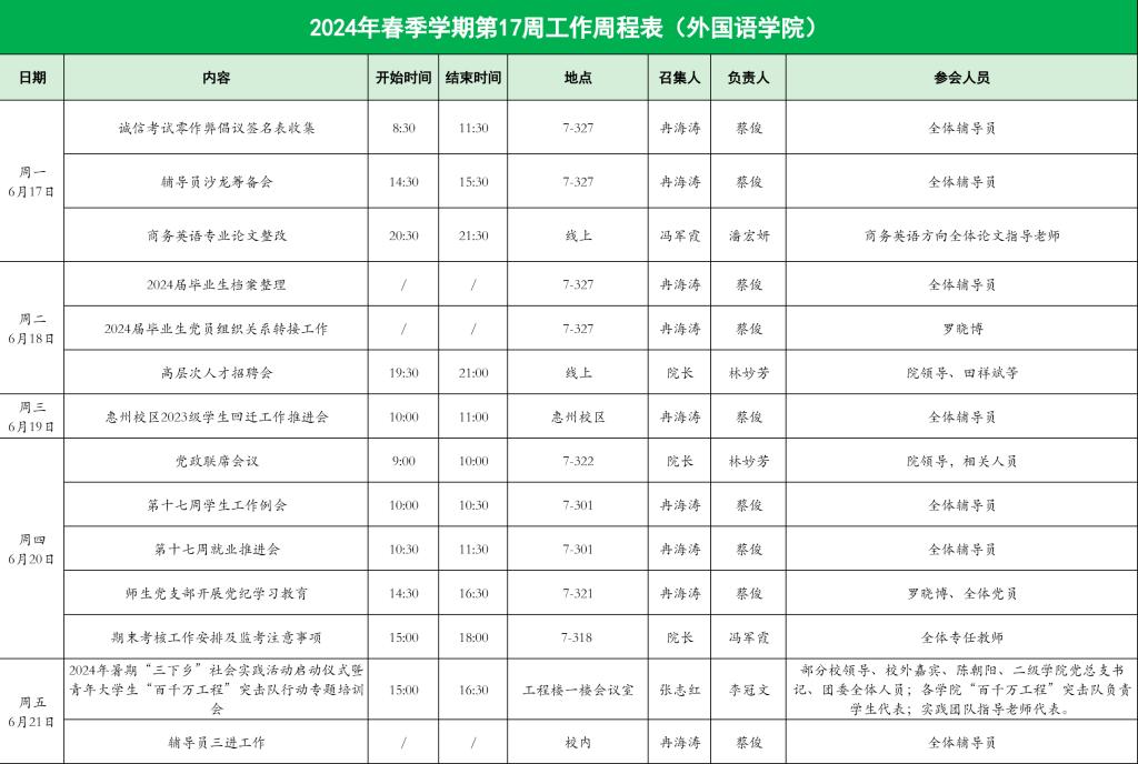 外国语学院2024年春季学期第17周工作周程表