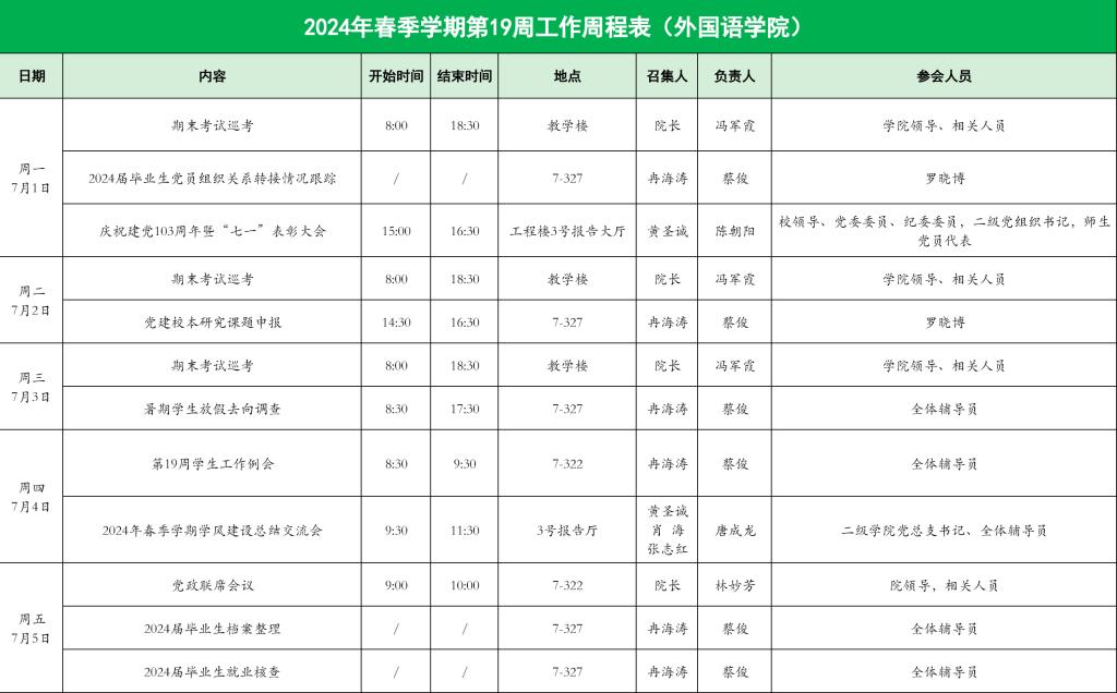 外国语学院2024年春季学期第19周工作周程表