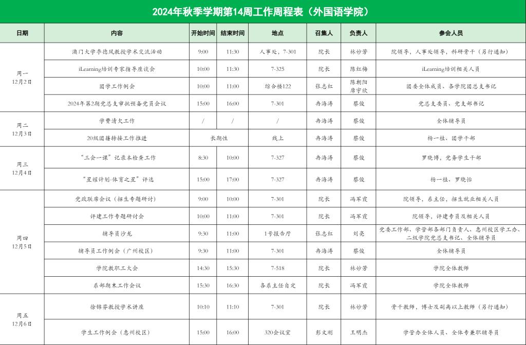 外国语学院2024年秋季学期第14周工作周程表