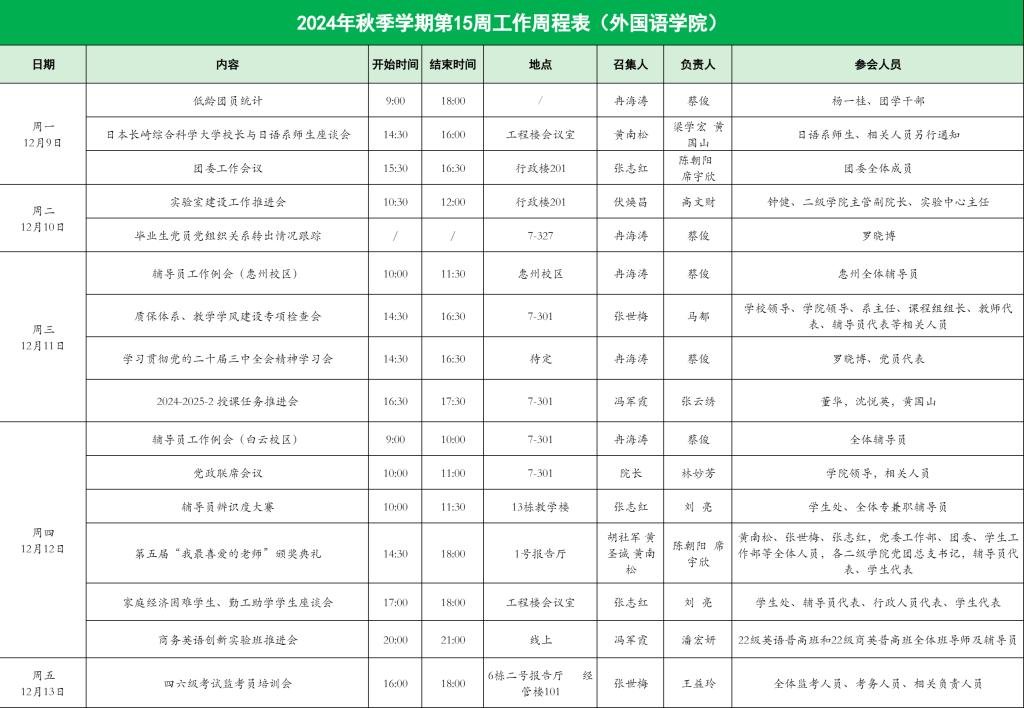 外国语学院2024年秋季学期第15周工作周程表