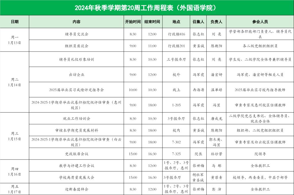 外国语学院2024年秋季学期第20周工作周程表