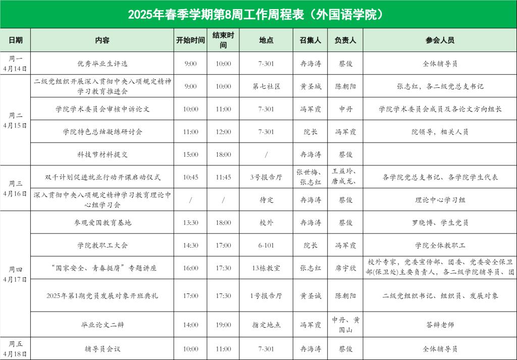 外国语学院2025年春季学期第8周工作周程表