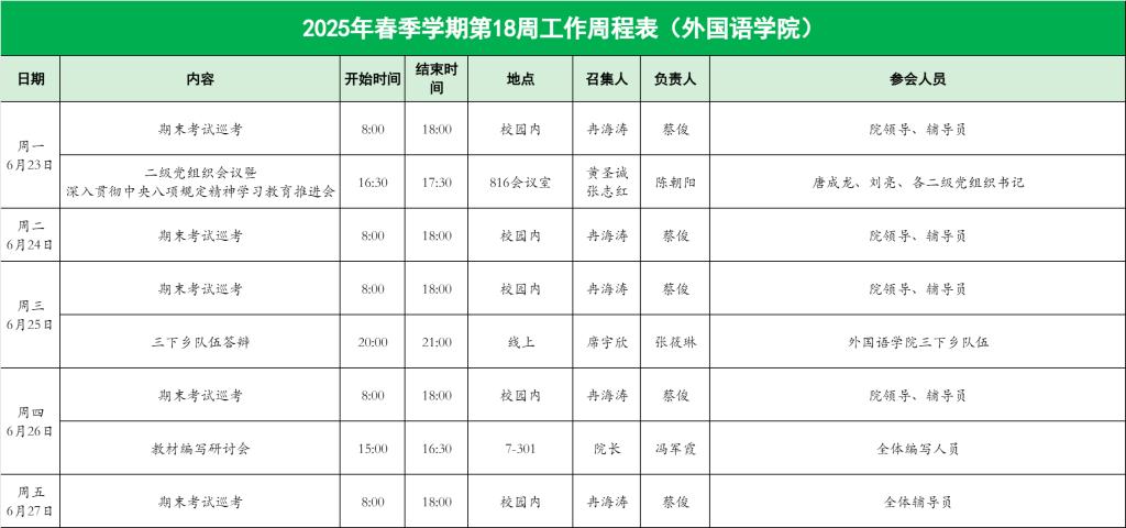 外国语学院2025年春季学期第18周工作周程表