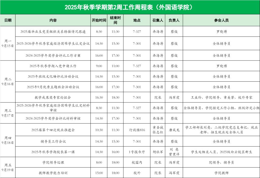 外国语学院2025年秋季学期第2周工作周程表