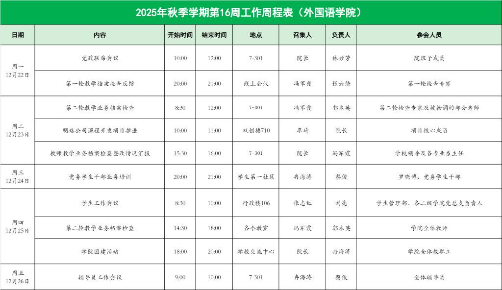 外国语学院2025年秋季学期第16周工作周程表