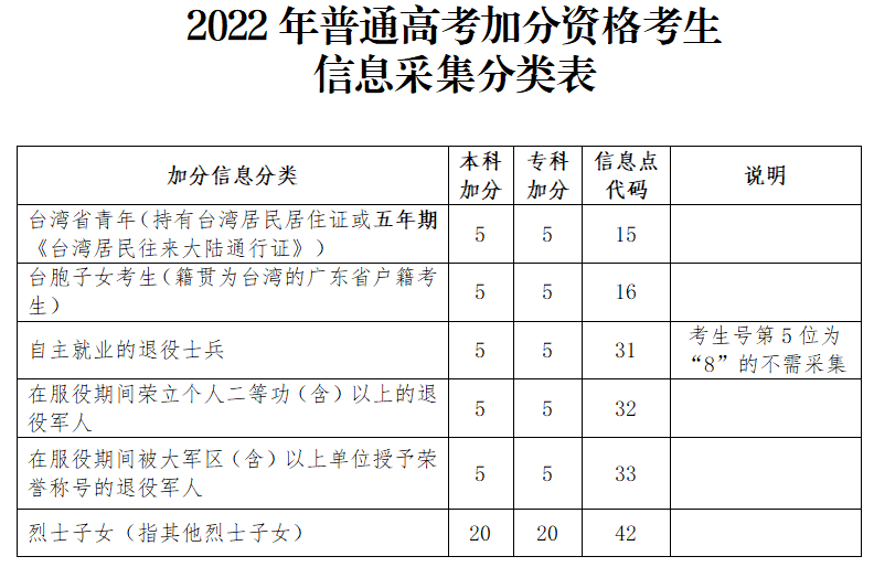 在《2022年普通高考加分资格考生信息采集分类表》《2022年普通高考同等条件下优先录取资格考生信息采集分类表》(见下图)中,凡信息点代码栏未注明“不需采集”的加分资格和优先录取资格类型,均在普通高考报名时申报。