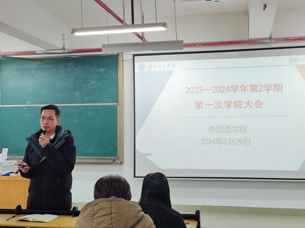 为谋新篇开新局,做好我院新学期工作的规划安排,确保新学期各项工作的有序进行。2月29日下午,外国语学院在13栋教学楼501教室召开2023—2024学年第2学期学院会议。韩院长,党总支书记、副院长冉海涛,党总支副书记蔡俊,副院长冯军霞及全体教师出席会议。会议由党总支书记、副院长冉海涛主持。