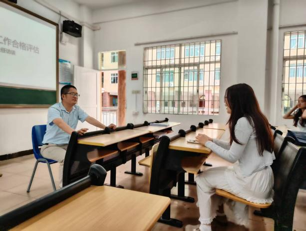 应用英语系教师访谈在6-105举行,由潘宏妍主任随机抽取了系部40%教师进行一对一访谈,重点考察教师对教学评估的认知深度,根据《本科教学评估访谈提纲》,要求教师结合自身教学实践,阐述自己在课堂教学中如何体现以学生能力培养为中心,如何进行教学方法、手段与学生能力培养改革,要求教师阐述“学生中心、产出导向、持续改进”等核心理念,并结合专业定位说明课程目标与毕业要求的支撑关系。