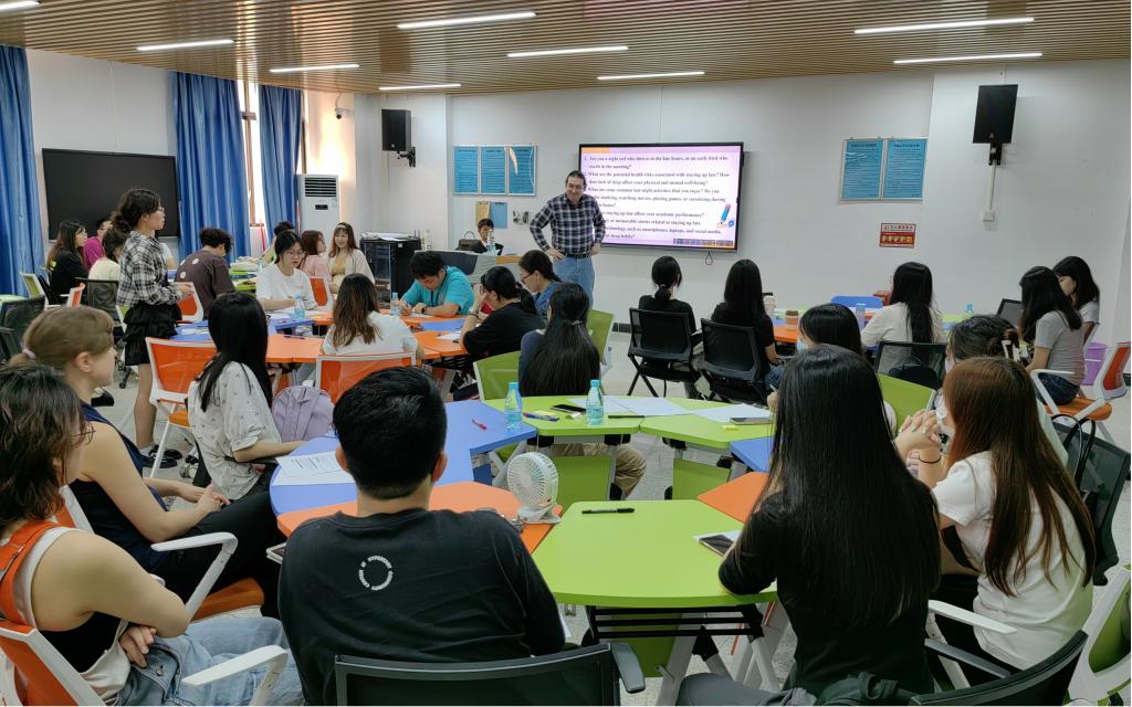 英语角邀请了两位外教和三位有留学经历的英语老师,为学生带来了精彩纷呈的语言学习体验。他们致力于培养学生英语口语表达能力,让学生在讨论中学习用英语表达观点、听取他人意见、进行跨文化交流。同时,教师们引导学生了解不同文化对待工作与休息的态度,培养他们的时间管理能力和健康意识。外教Andrew开展了破冰游戏。充满热情的互动让现场活力满满。