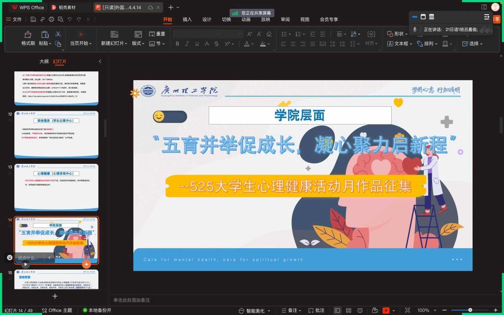 为切实推进学校心理健康教育工作,同时帮助学生提高生物安全意识,树立牢固的安全观。外国语学院于4月14日晚通过线上线下相结合的方式开展心理活动月介绍和生物安全法主题班会。我院全体学生参会。