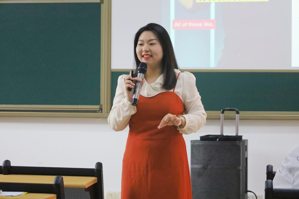 专场分享在热烈的欢呼声中开展。教学总监苏钰颖从“探究语言发音学习奥秘”、“剖析地道英语的发音特点”、“如何走出英语发音、口语的误区”三方面进行详细阐述。苏总监谈到改善发音时,建议同学们了解和掌握英语语流中的音变和韵律特征节奏,加强对连读、同化、失去爆破、句子重音、弱读、停顿的掌握,同时克服一些不良的发音习惯。苏总监充满激情的讲解及其幽默的教学风格使在座学生学习兴趣高涨。随后,我院已入职的学子邹玉林和郭美林给在座同学们表演了一段充满激情的英语秀,以风趣幽默的语言和灵活有趣的方式带动同学们积极互动,将分享会的氛围推向另一个高潮。最后,苏总监结合自身经历和丰富例句向同学们介绍了自然拼读法和读音规则两种记忆单词方法,在互动中强化了同学们对知识的吸收和掌握。同时她还针对单词发音要领和句子朗读技巧为我院学子进行讲解与指导,帮助其更轻松、高效地提升英语语音语调。